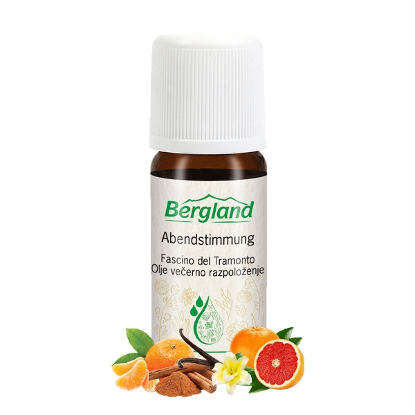 Eterično olje VEČERNO RAZPOLOŽENJE Bergland je mešanica 100 % naravnih olj pomaranče, smrekovih iglic, grenivke, rožmarina, cimeta in vanilije.